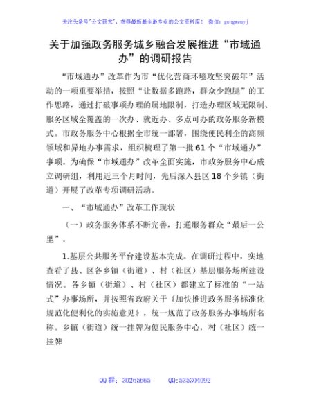 / 加强政务服务城乡融合发展推进“市域通办”的调研报告
