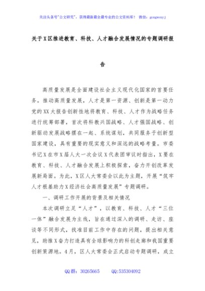 / 关于X区推进教育、科技、人才融合发展情况的专题调研报告