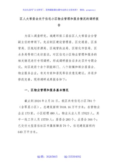 区人大常委会关于住宅小区物业管理和服务情况的调研报告