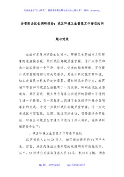 / 分管副县区长调研报告:城区环境卫生管理工作存在的问题与对策