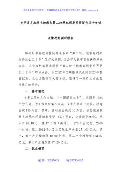 / 关于某县农村土地承包第二轮承包到期后再延包三十年试点情况的调研报告