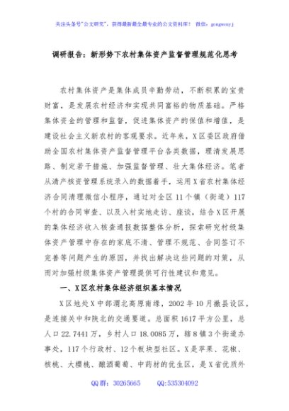 / 调研报告:新形势下农村集体资产监督管理规范化思考