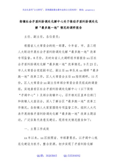 / 街镇社会矛盾纠纷调处化解中心关于推动矛盾纠纷调处化解“最多跑一地”情况的调研报告