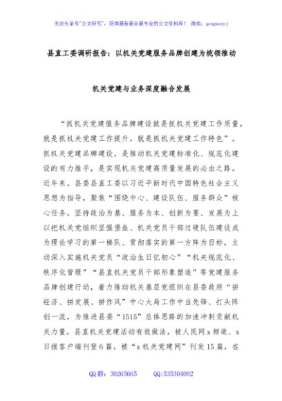 / 县直工委调研报告:以机关党建服务品牌创建为统领推动机关党建与业务深度融合发展