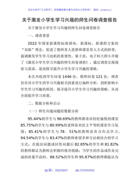 / 激发小学生学习兴趣的师生问卷调查报告(调研报告)