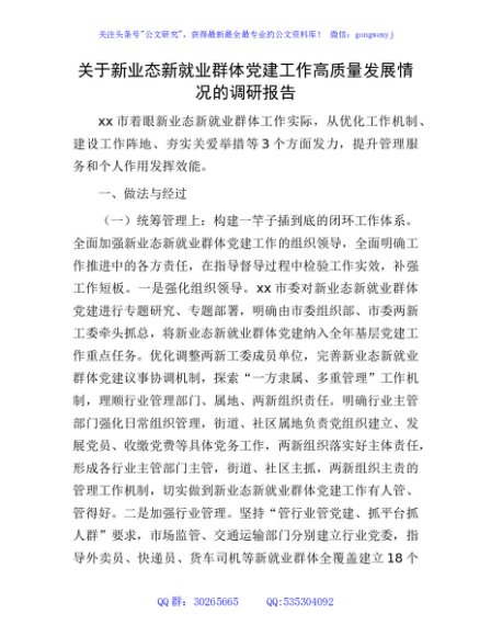 / 新业态新就业群体党建工作高质量发展情况的调研报告