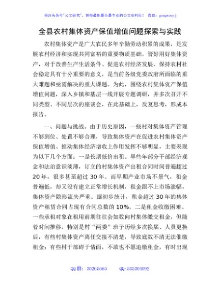 全县农村集体资产保值增值问题探索与实践(调研报告)