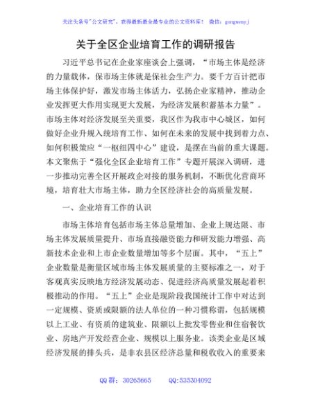 / 全区企业培育工作的调研报告