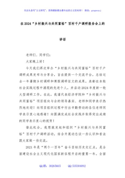 / 在2024“乡村振兴与共同富裕”百村千户调研报告会上的讲话
