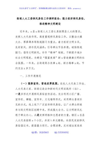 / 街道人大工委移风易俗工作调研报告:强力抓好移风易俗,推进精神文明建设