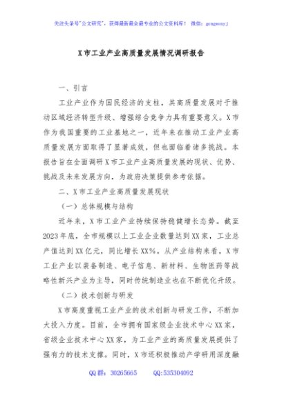 / X市工业产业高质量发展情况调研报告
