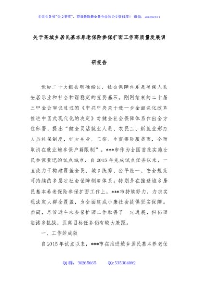/ 关于某城乡居民基本养老保险参保扩面工作高质量发展调研报告