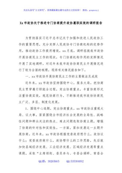 / Xx市政协关于推进专门协商提升政协履职实效的调研报告