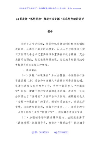 / XX县发扬“枫桥经验”推进司法资源下沉农村行动的调研报告
