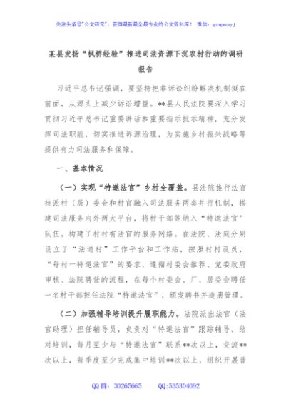 / 某县发扬“枫桥经验”推进司法资源下沉农村行动的调研报告