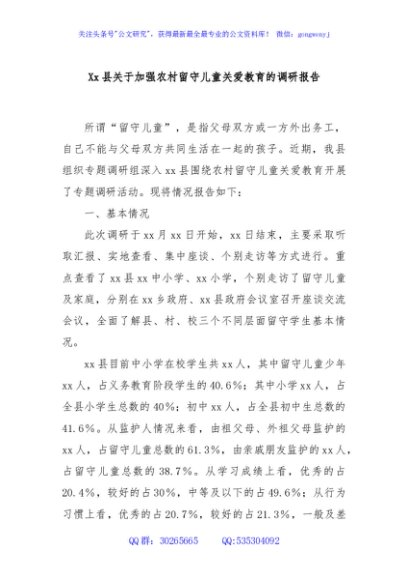/ Xx县关于加强农村留守儿童关爱教育的调研报告