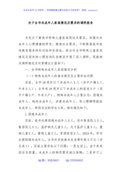 / 关于全市未成年人家庭情况及需求的调研报告
