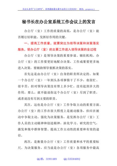 / 秘书长在办公室系统工作会议上的发言