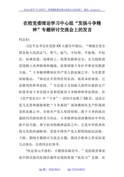 / 在校党委理论学习中心组“发扬斗争精神”专题研讨交流会上的发言