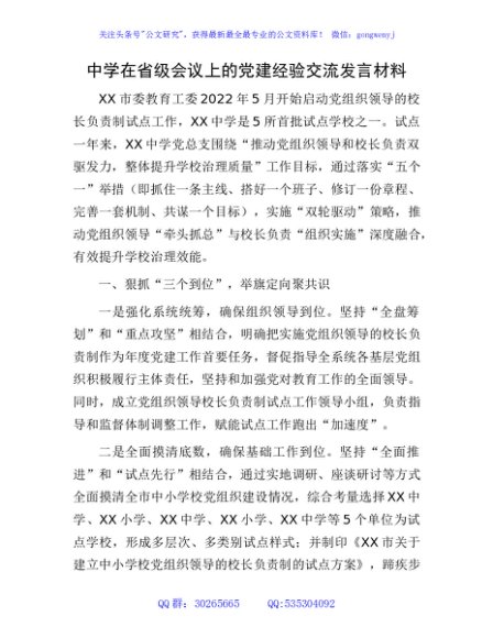 / 中学在省级会议上的党建经验交流发言(学校)