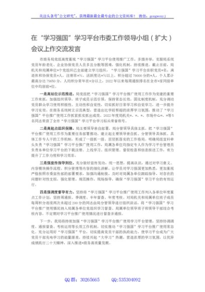 在“学习强国”学习平台市委工作领导小组(扩大)会议上作交流发言