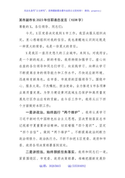 某市副市长2023年任职表态发言