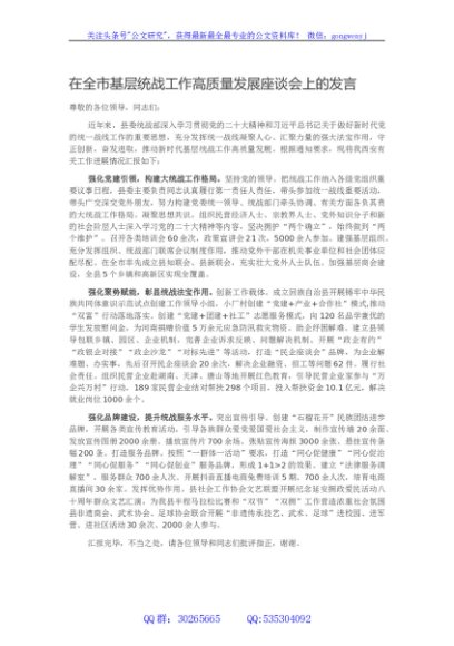 / 在全市基层统战工作高质量发展座谈会上的发言