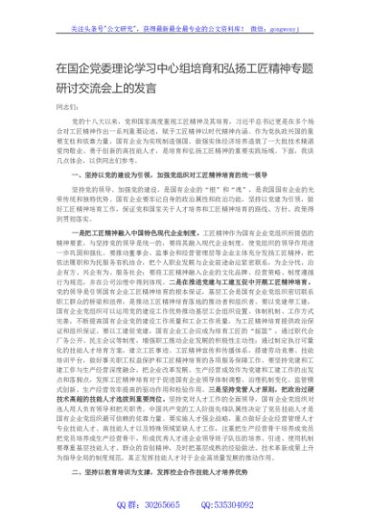 / 在国企党委理论学习中心组培育和弘扬工匠精神专题研讨交流会上的发言