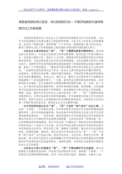 / 常委宣传部长研讨发言:学以致用知行合一 不断开创新时代宣传思想文化工作新局面