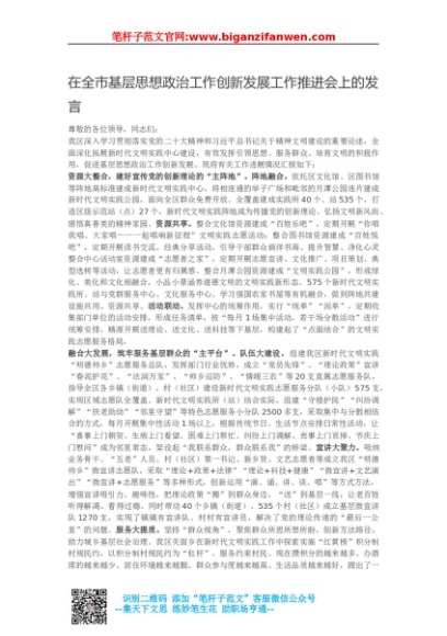 / 在全市基层思想政治工作创新发展工作推进会上的发言