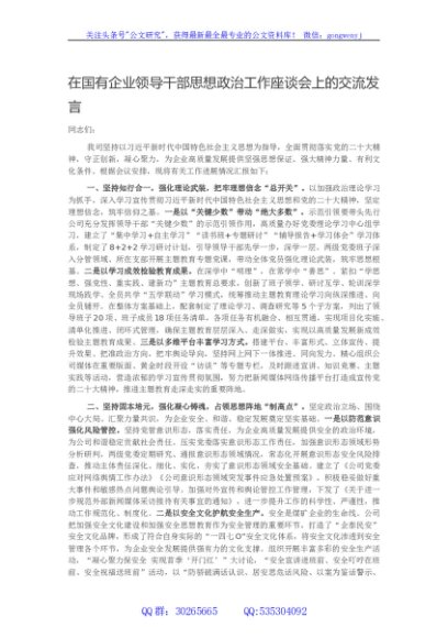 / 在国有企业领导干部思想政治工作座谈会上的交流发言