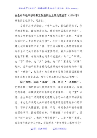 / 在全市年轻干部培养工作座谈会上的交流发言