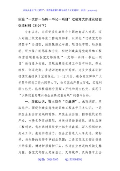 / 实施“一支部一品牌一书记一项目”过硬党支部建设经验交流材料