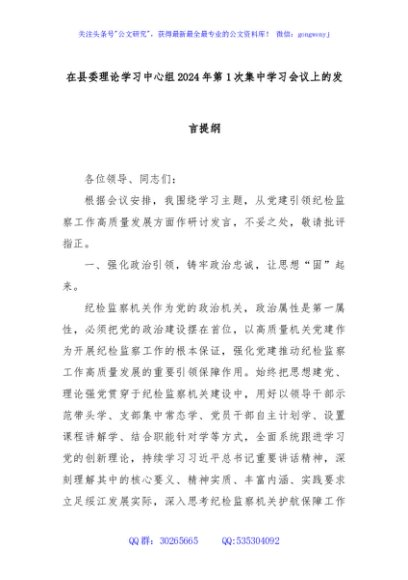 / 在县委理论学习中心组2024年第1次集中学习会议上的发言提纲