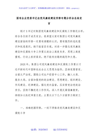 / 国有企业党委书记在党风廉政建设形势专题分析会总结发言