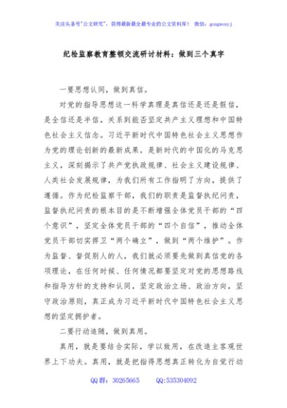 / 纪检监察教育整顿交流研讨材料:做到三个真字