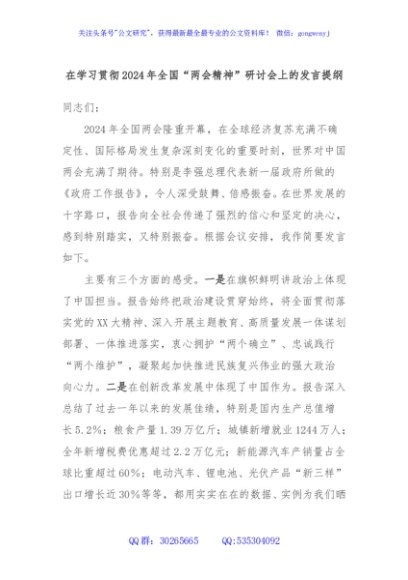 / 在学习贯彻2024年全国“两会精神”研讨会上的发言提纲