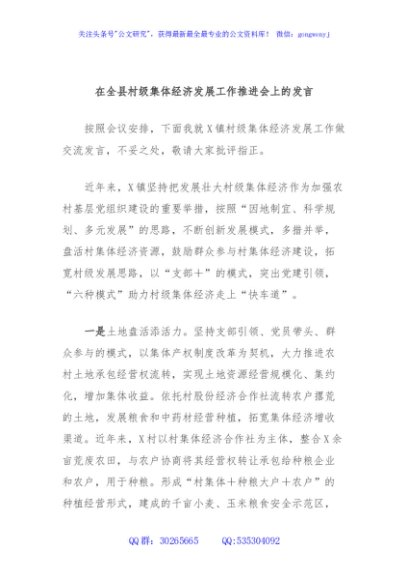 / 在全县村级集体经济发展工作推进会上的发言