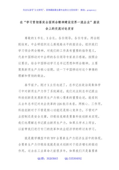 / 在“学习贯彻落实全国两会精神建设世界一流企业”座谈会上的交流讨论发言
