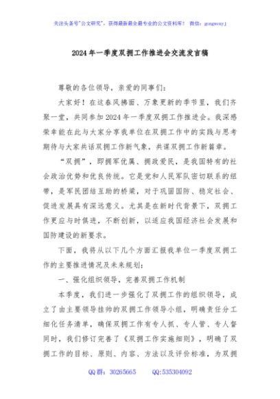 / 2024年一季度双拥工作推进会交流发言稿