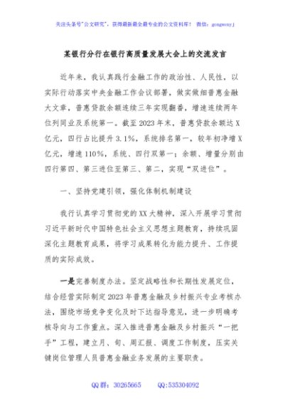 / 某银行分行在银行高质量发展大会上的交流发言