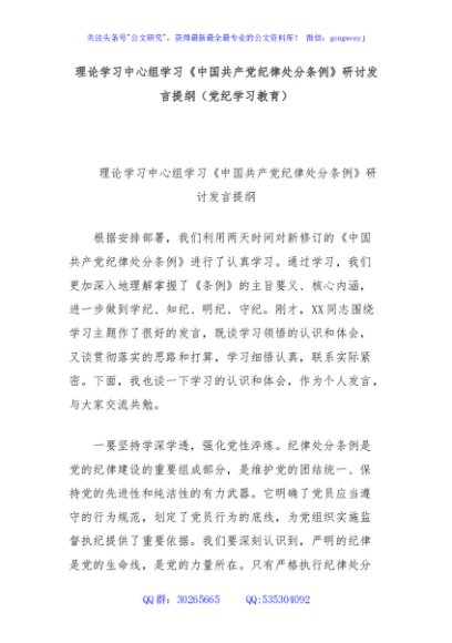 / 理论学习中心组学习《中国共产党纪律处分条例》研讨发言提纲(党纪学习教育)