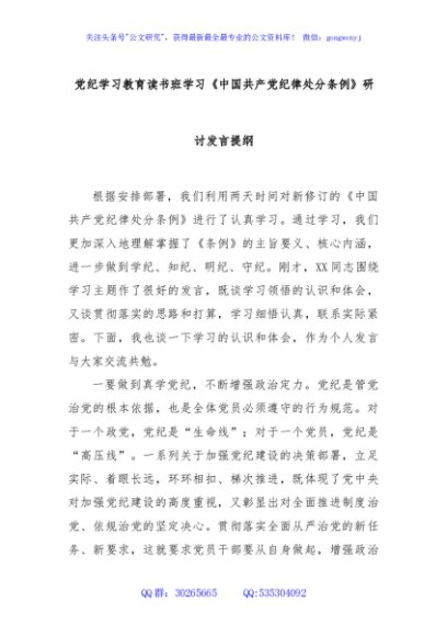 / 党纪学习教育读书班学习《中国共产党纪律处分条例》研讨发言提纲