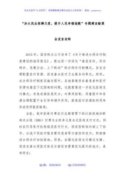 / “加大民生保障力度,提升人民幸福指数”专题建言献策会发言材料