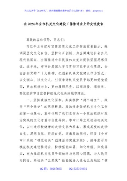 / 在2024年全市机关文化建设工作推进会上的交流发言