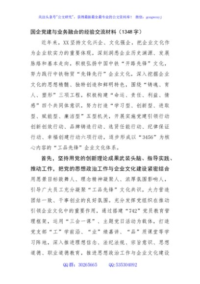 / 国企党建与业务融合的经验交流材料(1348字)