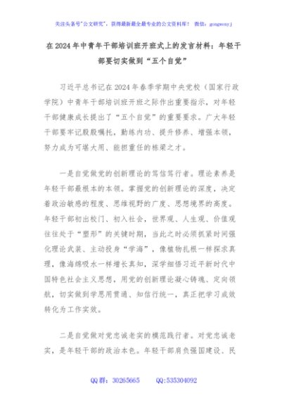 / 在2024年中青年干部培训班开班式上的发言材料:年轻干部要切实做到“五个自觉”