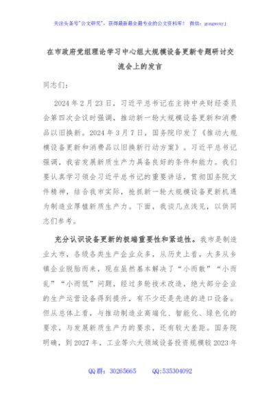 / 在市政府党组理论学习中心组大规模设备更新专题研讨交流会上的发言