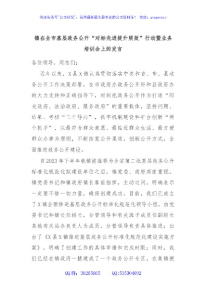 / 镇在全市基层政务公开“对标先进提升质效”行动暨业务培训会上的发言