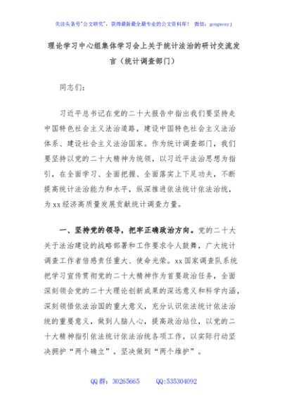 / 理论学习中心组集体学习会上关于统计法治的研讨交流发言(统计调查部门)